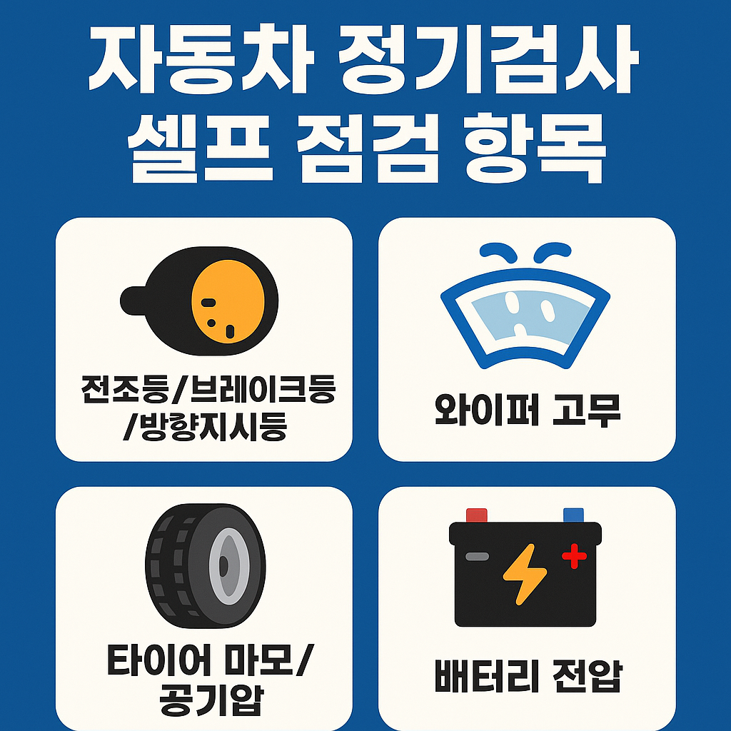 자동차 정기검사 전 전조등, 브레이크등, 방향지시등, 와이퍼 고무, 타이어 마모와 공기압, 배터리 전압 등 셀프 점검이 필요한 항목들을 안내하는 시각 이미지